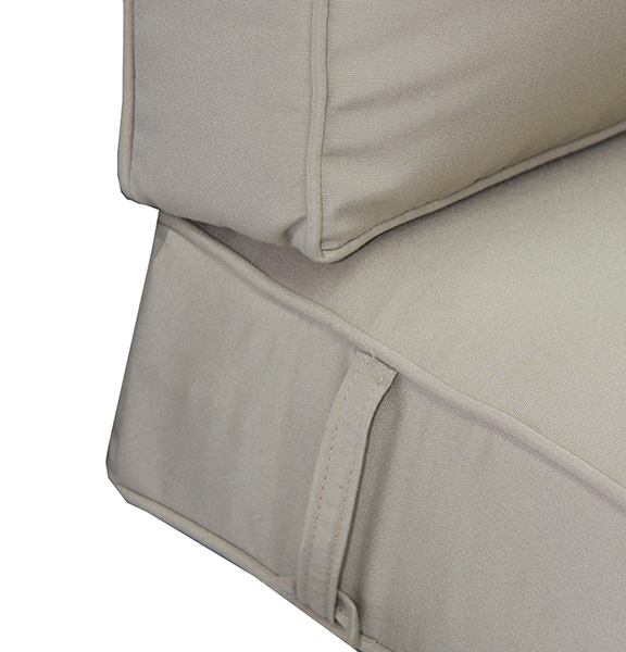 Enhance your outdoor seating with custom-sized, deep seating cushions featuring a refined boxed construction with double piping and an elegant, covered button detail on the back cushion. These cushions are designed for both style and comfort, adding a sophisticated touch to your patio furniture.
