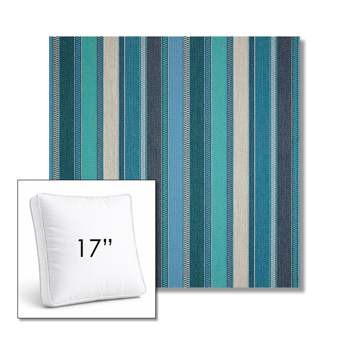 Custom 17" Square Boxed Sunbrella® Outdoor Pillow (3" Thick) available in over 700 Sunbrella® fabrics. Comes standard with piping. Optional covered button detail. Each pillow includes a zipper opening and premium outdoor insert for comfort, durability, and long-lasting outdoor performance.