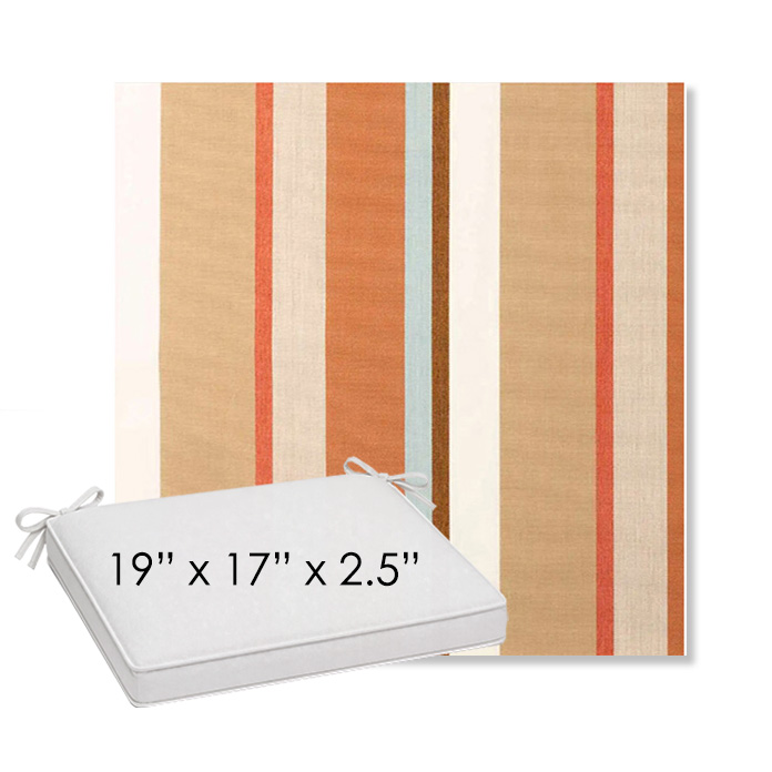 19" x 17" x 2.5" Thick outdoor dining chair seat cushion designed for a simple, ready-to-order fit. Features a boxed construction with piping, fabric ties, and zipper opening. Made in 700+ Sunbrella® fabrics for long-lasting outdoor performance.