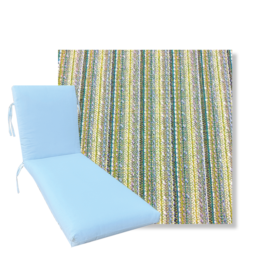 Classic Style Chaise Lounge Cushion. Premium Universal Chaise Lounge Replacement Cushions in 3 common sizes. Simple center seam design. No piping. Designed to accommodate aluminum, wood, and PVC furniture. Includes fabric ties at back and hinge. Polyester/densified fiber fill.
