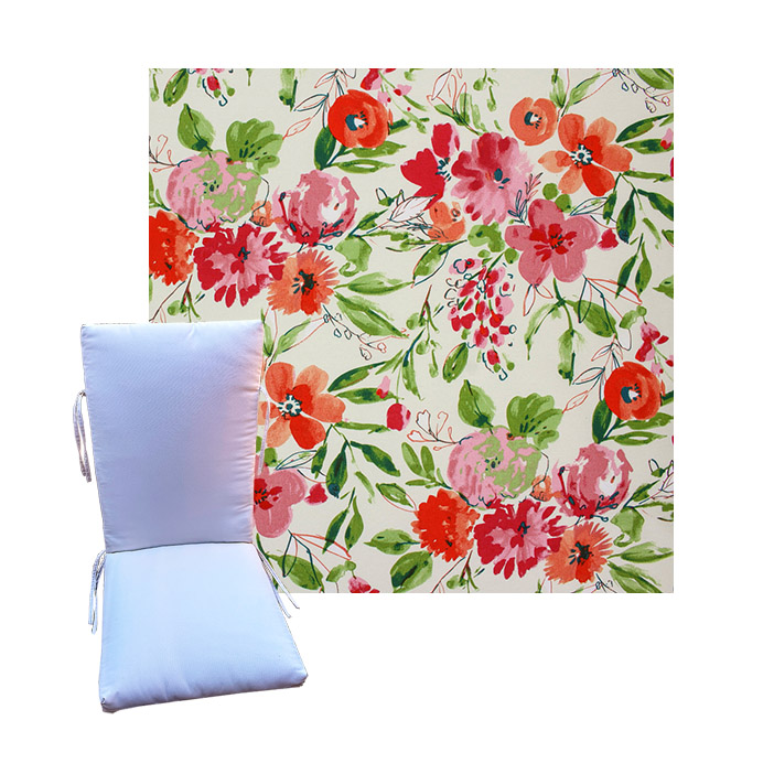 Order universal patio chair cushions in Richloom Solarium Outdoor Fabrics - Find a new colorful replacement cushion in 9 sizes - This style of patio chair cushion features a center seam, hinged design with fabric ties. These outdoor cushions are custom made to order in the fabric and size you need.