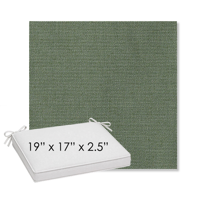 19" x 17" x 2.5" Thick outdoor dining chair seat cushion designed for a simple, ready-to-order fit. Features a boxed construction with piping, fabric ties, and zipper opening. Made in 700+ Sunbrella® fabrics for long-lasting outdoor performance.