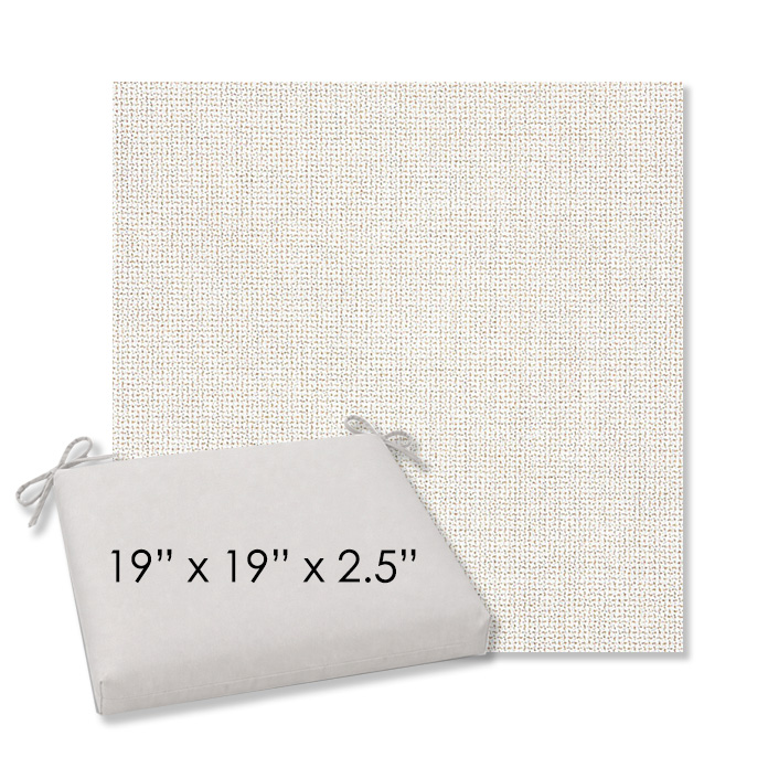 19" x 19" x 2.5" Thick - Universal outdoor dining chair seat cushion in Sunbrella Solution Dyed Polyester Outdoor Fabrics. Features with generous fabric ties and outdoor foam with polyester fiber fill—perfect for most patio dining chairs. Each Outdoor Patio Dining Chair Cushion is a center seam design and 2.5" Thick. All patio dining chair cushions are custom made to order in the size and fabric of your choice.