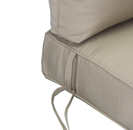 Enhance your outdoor seating with custom-sized, deep seating cushions featuring a refined boxed construction with double piping and an elegant, covered button detail on the back cushion. These cushions are designed for both style and comfort, adding a sophisticated touch to your patio furniture.