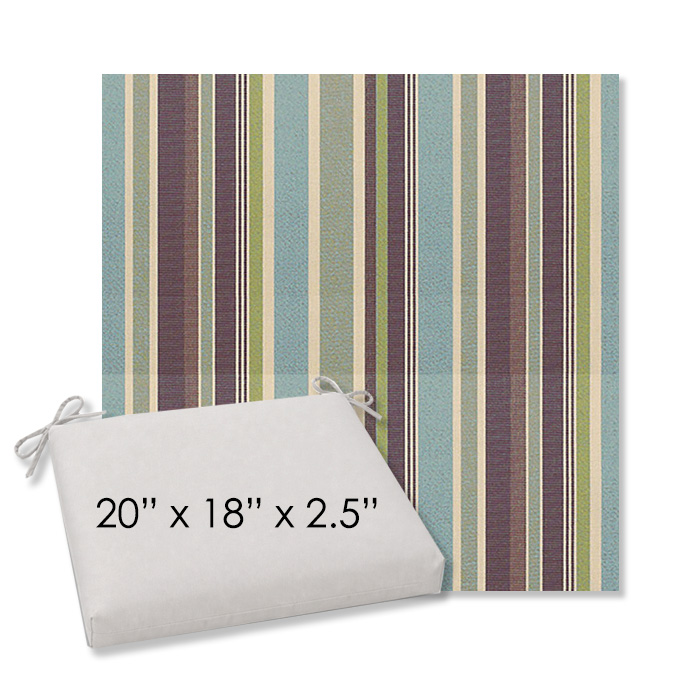 20" x 18" x 2.5" Thick - Universal outdoor dining chair seat cushion in Sunbrella Solution Dyed Polyester Outdoor Fabrics. Features with generous fabric ties and outdoor foam with polyester fiber fill—perfect for most patio dining chairs. Each Outdoor Patio Dining Chair Cushion is a center seam design and 2.5" Thick. All patio dining chair cushions are custom made to order in the size and fabric of your choice.