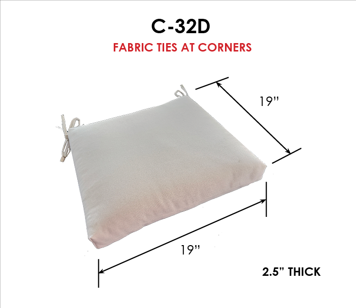 Looking for larger quantities for your commercial property, HOA, Hotel, Country Club, Swim Club or Apartment Complex. Universal outdoor dining chair seat cushion in Sunbrella Fabrics- Solution dyed acrylics with a 5 year warranty. Available in 4 universal sizes with generous fabric ties and outdoor foam with polyester fiber fill—perfect for most patio dining chairs. Simple Center Seam Design. Each cushion is approximate 2.5" Thick. Buy more and save on matching seat cushions for your outdoor space. All patio dining chair cushions are custom made to order in the size and fabric of your choice.