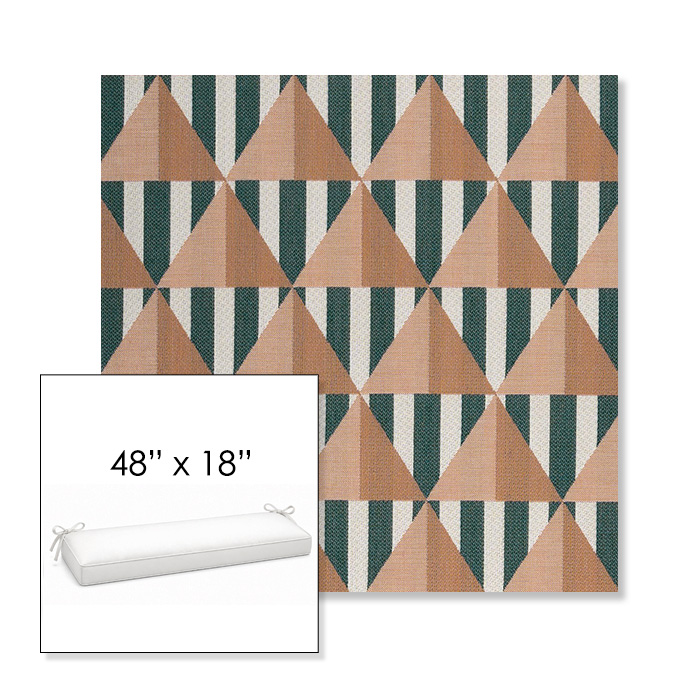 48" outdoor bench cushion designed for a simple, ready-to-order fit. Features a boxed construction with piping, fabric ties, and zipper opening. Made in 700+ Sunbrella® fabrics for long-lasting outdoor performance.