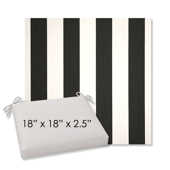 18" x 18" x 2.5" Thick - Universal outdoor dining chair seat cushion in Sunbrella Solution Dyed Polyester Outdoor Fabrics. Features with generous fabric ties and outdoor foam with polyester fiber fill—perfect for most patio dining chairs. Each Outdoor Patio Dining Chair Cushion is a center seam design and 2.5" Thick. All patio dining chair cushions are custom made to order in the size and fabric of your choice.