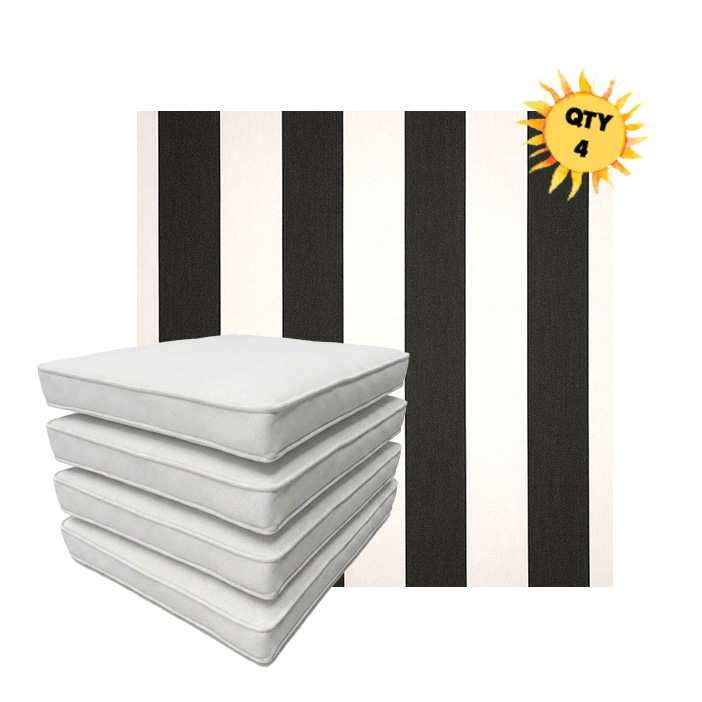 Bundle and save with custom outdoor dining chair seat cushions. Boxed and double piped, these patio dining cushions are an elegant and simple way to update your outdoor dining space. Available in 4 sizes, each dining chair seat cushion includes a zipper opening and fabric ties. Bundles in sets of 4, the more sets you buy, the more your save. Available in hundreds of Sunbrella outdoor fabrics, each patio dining chair cushion is custom made to order in the size you need and that fabric of your choice.