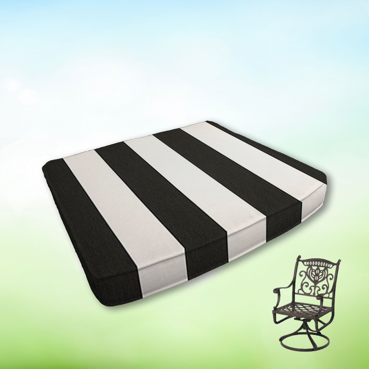 Product images digitally represent the selected Sunbrella fabric on the cushion shape. Fabric pattern scale in the preview is not exact and colors vary by screen. For best results, request fabric swatches to verify color and texture in your lighting.