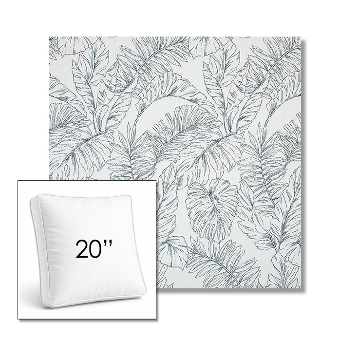 Custom 20" Square Boxed Sunbrella® Outdoor Pillow (3" Thick) available in over 700 Sunbrella® fabrics. Comes standard with piping. Optional covered button detail. Each pillow includes a zipper opening and premium outdoor insert for comfort, durability, and long-lasting outdoor performance.