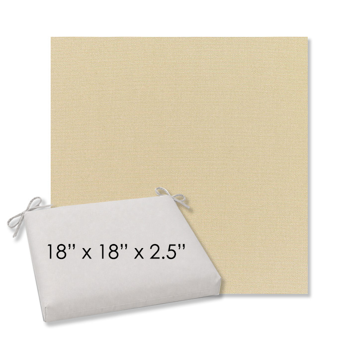 18" x 18" x 2.5" Thick - Universal outdoor dining chair seat cushion in Sunbrella Solution Dyed Polyester Outdoor Fabrics. Features with generous fabric ties and outdoor foam with polyester fiber fill—perfect for most patio dining chairs. Each Outdoor Patio Dining Chair Cushion is a center seam design and 2.5" Thick. All patio dining chair cushions are custom made to order in the size and fabric of your choice.