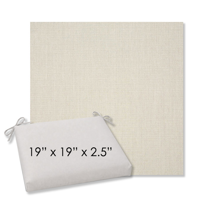 19" x 19" x 2.5" Thick - Universal outdoor dining chair seat cushion in Sunbrella Solution Dyed Polyester Outdoor Fabrics. Features with generous fabric ties and outdoor foam with polyester fiber fill—perfect for most patio dining chairs. Each Outdoor Patio Dining Chair Cushion is a center seam design and 2.5" Thick. All patio dining chair cushions are custom made to order in the size and fabric of your choice.