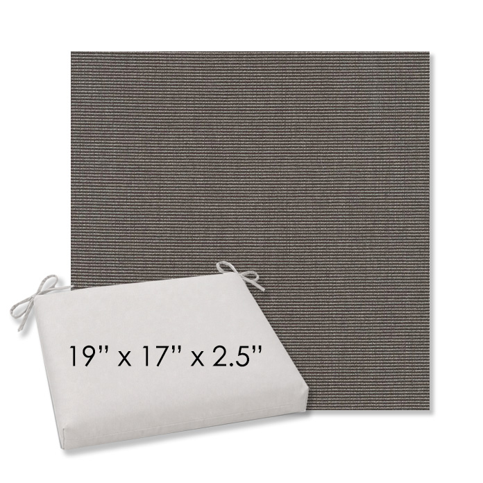 19" x 17" x 2.5" Thick - Universal outdoor dining chair seat cushion in Sunbrella Solution Dyed Polyester Outdoor Fabrics. Features with generous fabric ties and outdoor foam with polyester fiber fill—perfect for most patio dining chairs. Each Outdoor Patio Dining Chair Cushion is a center seam design and 2.5" Thick. All patio dining chair cushions are custom made to order in the size and fabric of your choice.