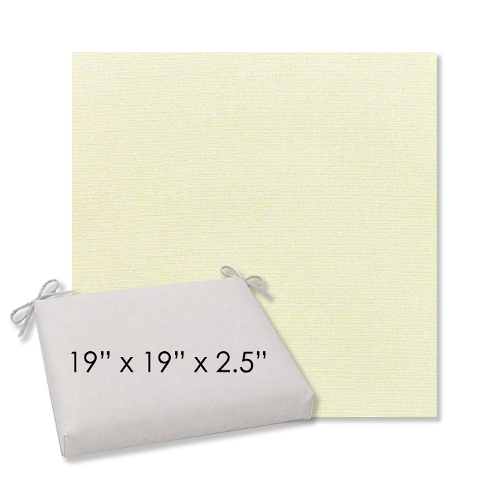19" x 19" x 2.5" Thick - Universal outdoor dining chair seat cushion in Sunbrella Solution Dyed Polyester Outdoor Fabrics. Features with generous fabric ties and outdoor foam with polyester fiber fill—perfect for most patio dining chairs. Each Outdoor Patio Dining Chair Cushion is a center seam design and 2.5" Thick. All patio dining chair cushions are custom made to order in the size and fabric of your choice.