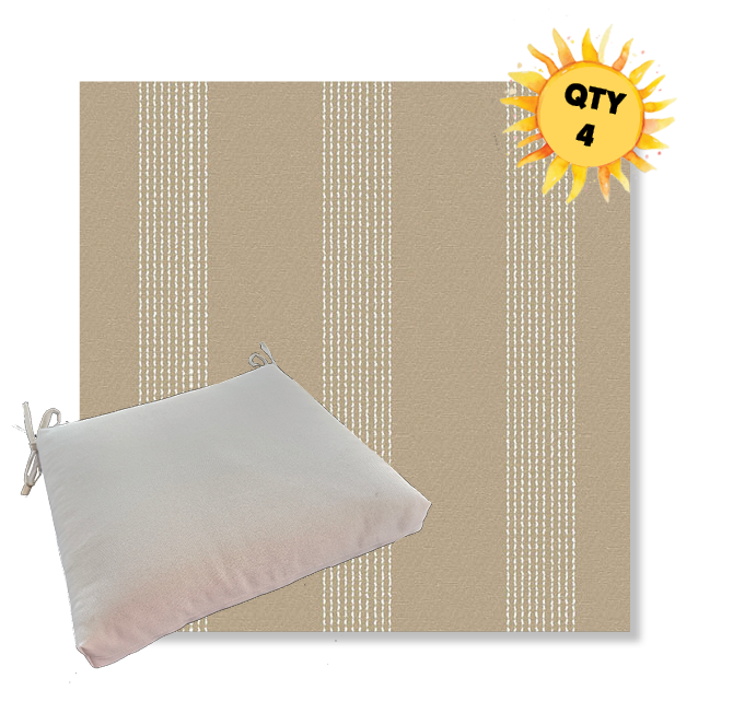 Sunbrella® Luxury Seat Cushions — Bundle of 4 (Custom Made) Upgrade your outdoor dining space with a coordinated set of four luxury Sunbrella® seat cushions, crafted in our most upscale Sunbrella fabric selections. These are made for patios that don’t do “average”—the kind of outdoor setting where every detail feels intentional, elevated, and unmistakably well-designed. Each bundle is custom made to order for a tailored look and feel, with premium construction designed for long-lasting comfort and performance. Choose from four versatile sizes to fit most outdoor dining chair styles, then select a higher-end Sunbrella® fabric that instantly sets your space apart from the run-of-the-mill cushion look.