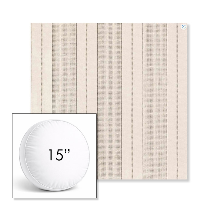 Custom 15" Round Boxed Sunbrella® Outdoor Pillow (3" Thick) available in over 700 Sunbrella® fabrics. Comes standard with piping. Optional covered button detail. Each pillow includes a zipper opening and premium outdoor insert for comfort, durability, and long-lasting outdoor performance.