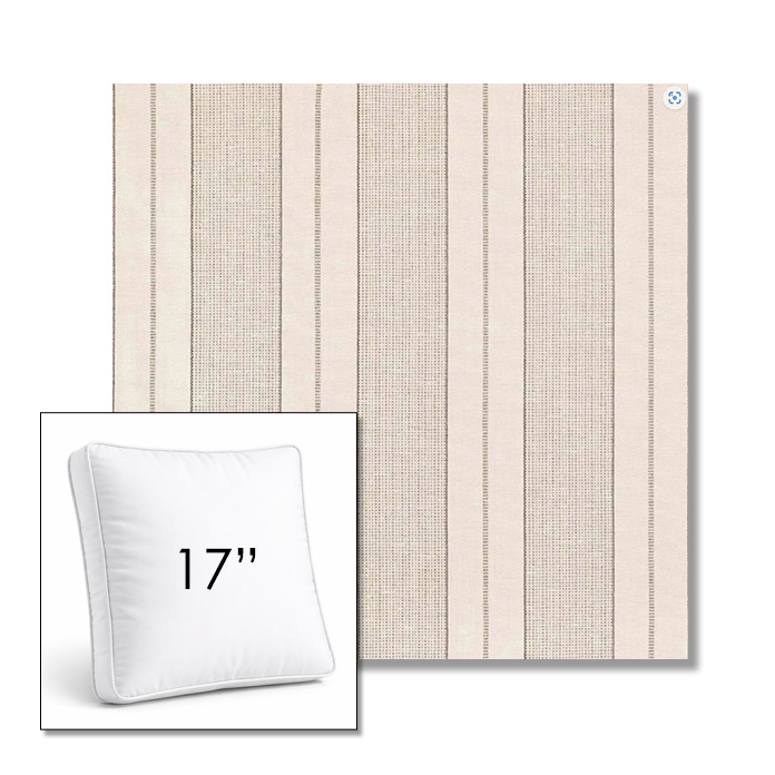 Custom 17" Square Boxed Sunbrella® Outdoor Pillow (3" Thick) available in over 700 Sunbrella® fabrics. Comes standard with piping. Optional covered button detail. Each pillow includes a zipper opening and premium outdoor insert for comfort, durability, and long-lasting outdoor performance.