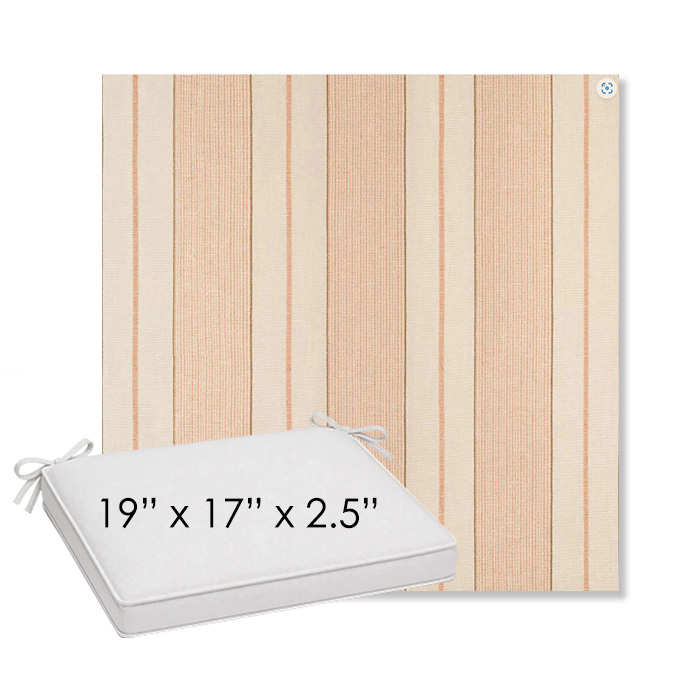 19" x 17" x 2.5" Thick outdoor dining chair seat cushion designed for a simple, ready-to-order fit. Features a boxed construction with piping, fabric ties, and zipper opening. Made in 700+ Sunbrella® fabrics for long-lasting outdoor performance.