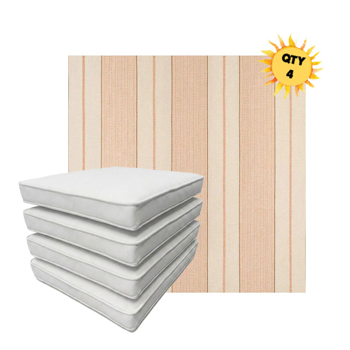 Bundle and save with custom outdoor dining chair seat cushions. Boxed and double piped, these patio dining cushions are an elegant and simple way to update your outdoor dining space. Available in 4 sizes, each dining chair seat cushion includes a zipper opening and fabric ties. Bundles in sets of 4, the more sets you buy, the more your save. Available in hundreds of Sunbrella outdoor fabrics, each patio dining chair cushion is custom made to order in the size you need and that fabric of your choice.