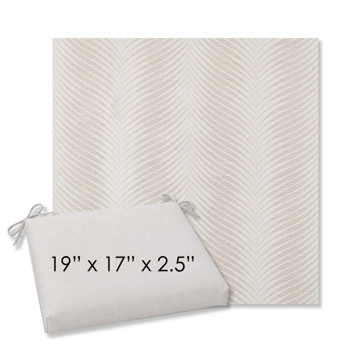 19" x 17" x 2.5" Thick - Universal outdoor dining chair seat cushion in Sunbrella Solution Dyed Polyester Outdoor Fabrics. Features with generous fabric ties and outdoor foam with polyester fiber fill—perfect for most patio dining chairs. Each Outdoor Patio Dining Chair Cushion is a center seam design and 2.5" Thick. All patio dining chair cushions are custom made to order in the size and fabric of your choice.