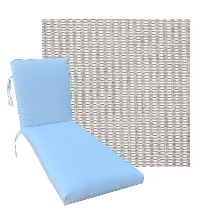 Classic Style Chaise Lounge Cushion. Premium Universal Chaise Lounge Replacement Cushions in 3 common sizes. Simple center seam design. No piping. Designed to accommodate aluminum, wood, and PVC furniture. Includes fabric ties at back and hinge. Polyester/densified fiber fill.
