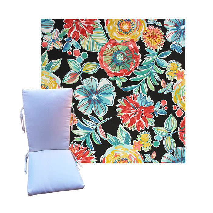Order universal patio chair cushions in Richloom Solarium Outdoor Fabrics - Find a new colorful replacement cushion in 9 sizes - This style of patio chair cushion features a center seam, hinged design with fabric ties. These outdoor cushions are custom made to order in the fabric and size you need.
