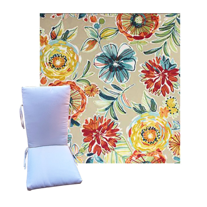 Order universal patio chair cushions in Richloom Solarium Outdoor Fabrics - Find a new colorful replacement cushion in 9 sizes - This style of patio chair cushion features a center seam, hinged design with fabric ties. These outdoor cushions are custom made to order in the fabric and size you need.