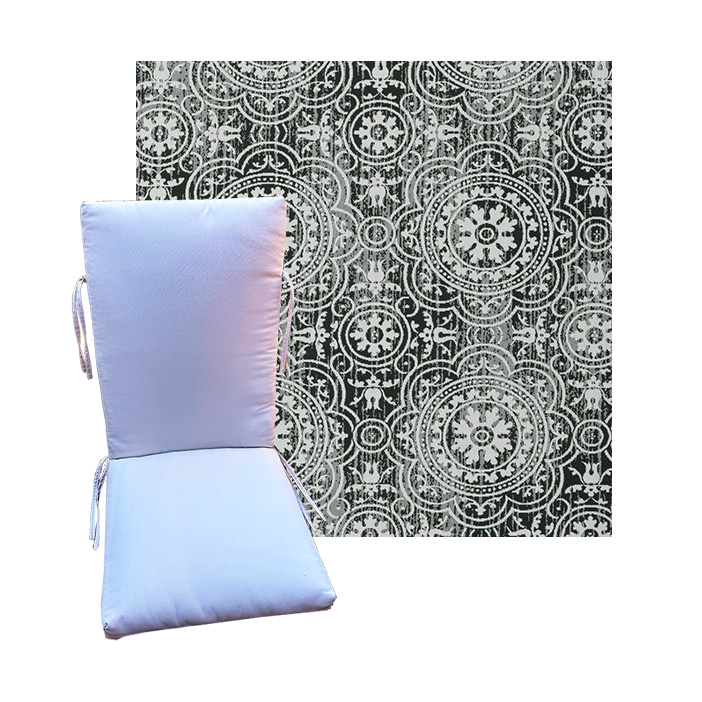 Order universal patio chair cushions in Outdura Outdoor Fabrics - Find a new colorful replacement cushion in 9 sizes - This style of patio chair cushion features a center seam, hinged design with fabric ties. These outdoor cushions are custom made to order in the fabric and size you need. See details on available sizes in the overview section below. BUY MORE and save.