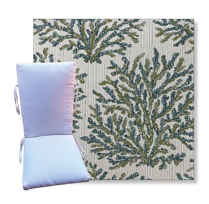 Order universal patio chair cushions in Revolution Outdoor Fabrics - Find a new colorful replacement cushion in 9 sizes - This style of patio chair cushion features a center seam, hinged design with fabric ties. These outdoor cushions are custom made to order in the fabric and size you need.