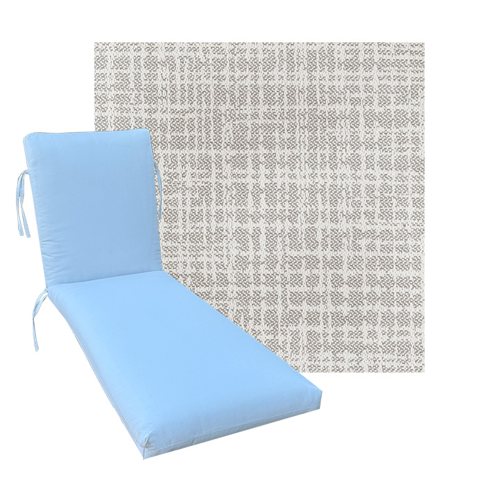 Classic Style Chaise Lounge Cushion. Premium Universal Chaise Lounge Replacement Cushions in 3 common sizes. Simple center seam design. No piping. Designed to accommodate aluminum, wood, and PVC furniture. Includes fabric ties at back and hinge. Polyester/densified fiber fill.