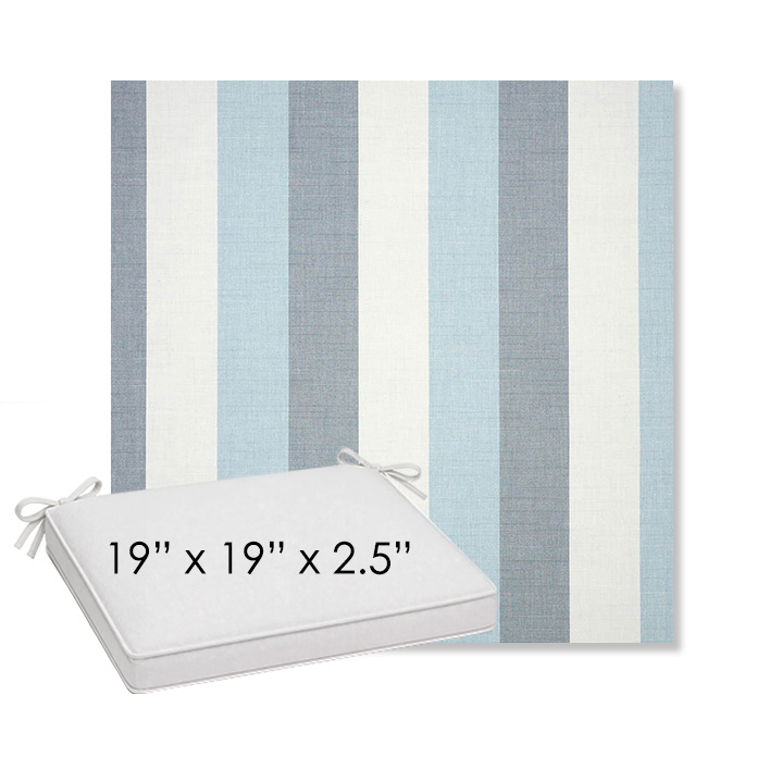 19" x 19" x 2.5" Thick outdoor dining chair seat cushion designed for a simple, ready-to-order fit. Features a boxed construction with piping, fabric ties, and zipper opening. Made in 700+ Sunbrella® fabrics for long-lasting outdoor performance.