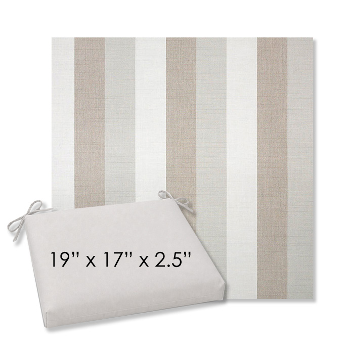 19" x 17" x 2.5" Thick - Universal outdoor dining chair seat cushion in Sunbrella Solution Dyed Polyester Outdoor Fabrics. Features with generous fabric ties and outdoor foam with polyester fiber fill—perfect for most patio dining chairs. Each Outdoor Patio Dining Chair Cushion is a center seam design and 2.5" Thick. All patio dining chair cushions are custom made to order in the size and fabric of your choice.