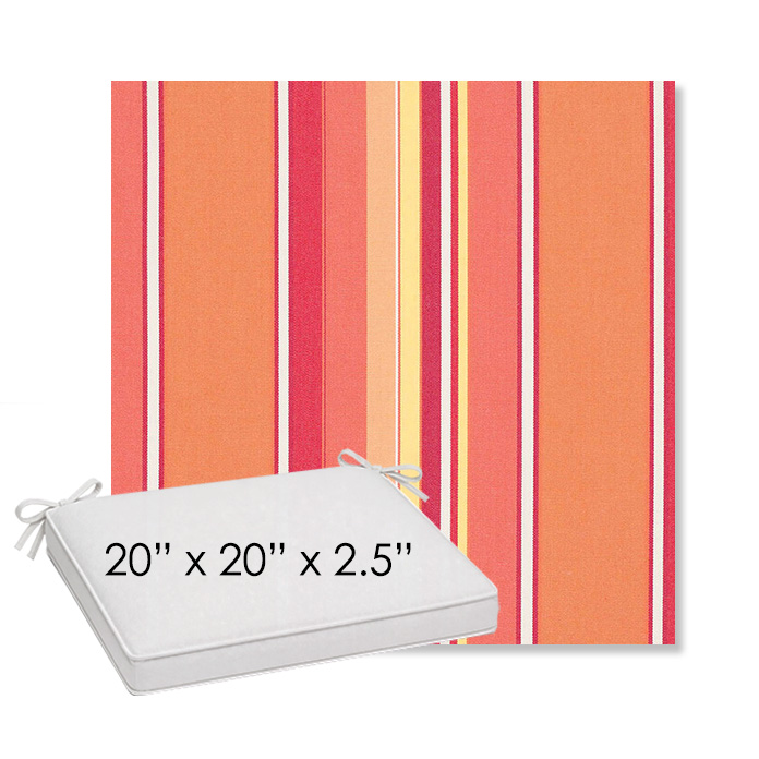 20" x 20" x 2.5" Thick outdoor dining chair seat cushion designed for a simple, ready-to-order fit. Features a boxed construction with piping, fabric ties, and zipper opening. Made in 700+ Sunbrella® fabrics for long-lasting outdoor performance.