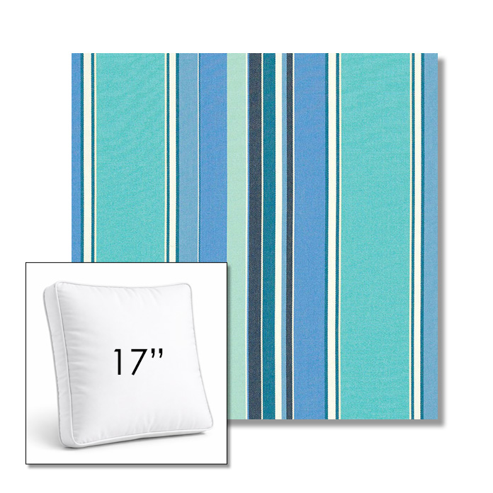 Custom 17" Square Boxed Sunbrella® Outdoor Pillow (3" Thick) available in over 700 Sunbrella® fabrics. Comes standard with piping. Optional covered button detail. Each pillow includes a zipper opening and premium outdoor insert for comfort, durability, and long-lasting outdoor performance.