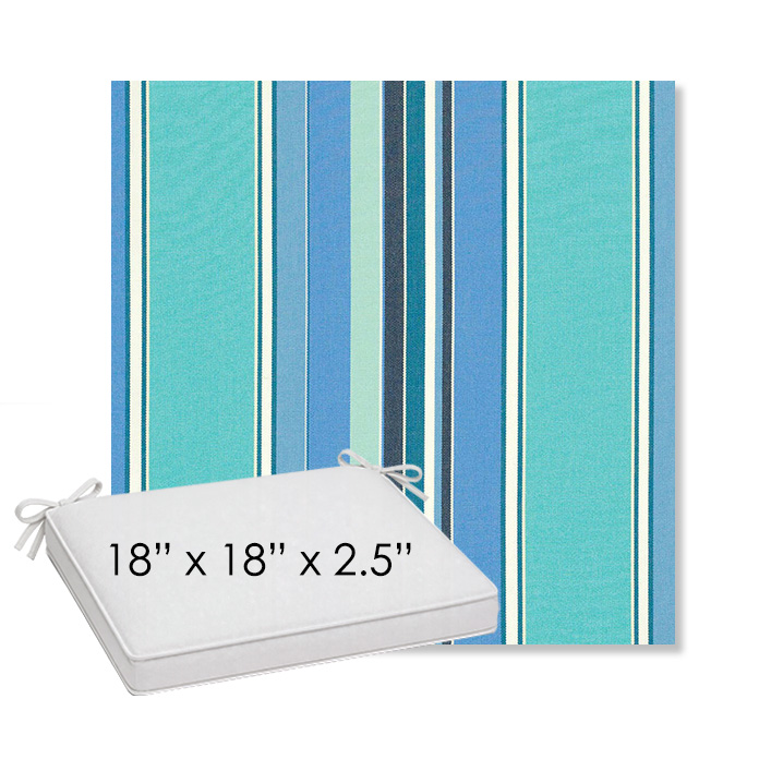 18" x 18" x 2.5" Thick outdoor dining chair seat cushion designed for a simple, ready-to-order fit. Features a boxed construction with piping, fabric ties, and zipper opening. Made in 700+ Sunbrella® fabrics for long-lasting outdoor performance.