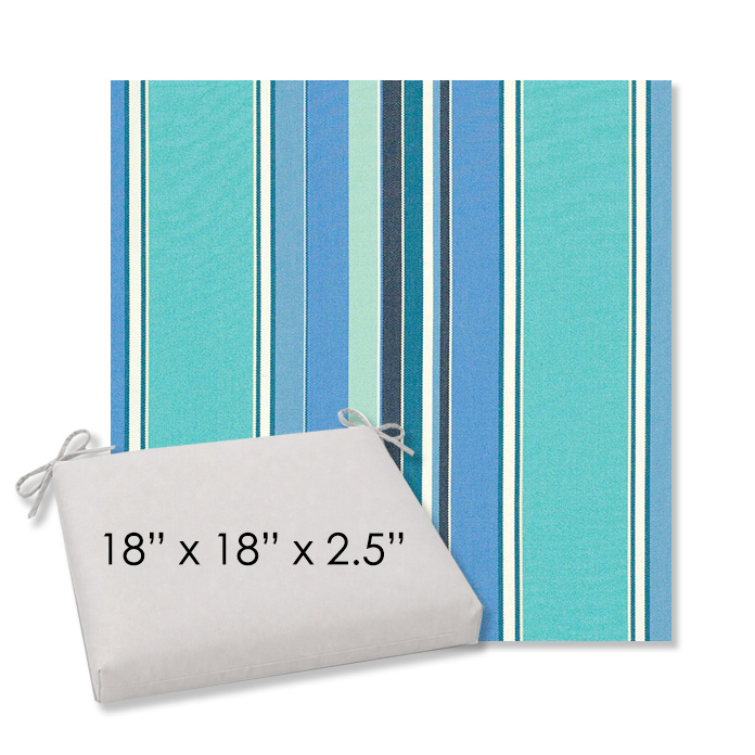18" x 18" x 2.5" Thick - Universal outdoor dining chair seat cushion in Sunbrella Solution Dyed Polyester Outdoor Fabrics. Features with generous fabric ties and outdoor foam with polyester fiber fill—perfect for most patio dining chairs. Each Outdoor Patio Dining Chair Cushion is a center seam design and 2.5" Thick. All patio dining chair cushions are custom made to order in the size and fabric of your choice.