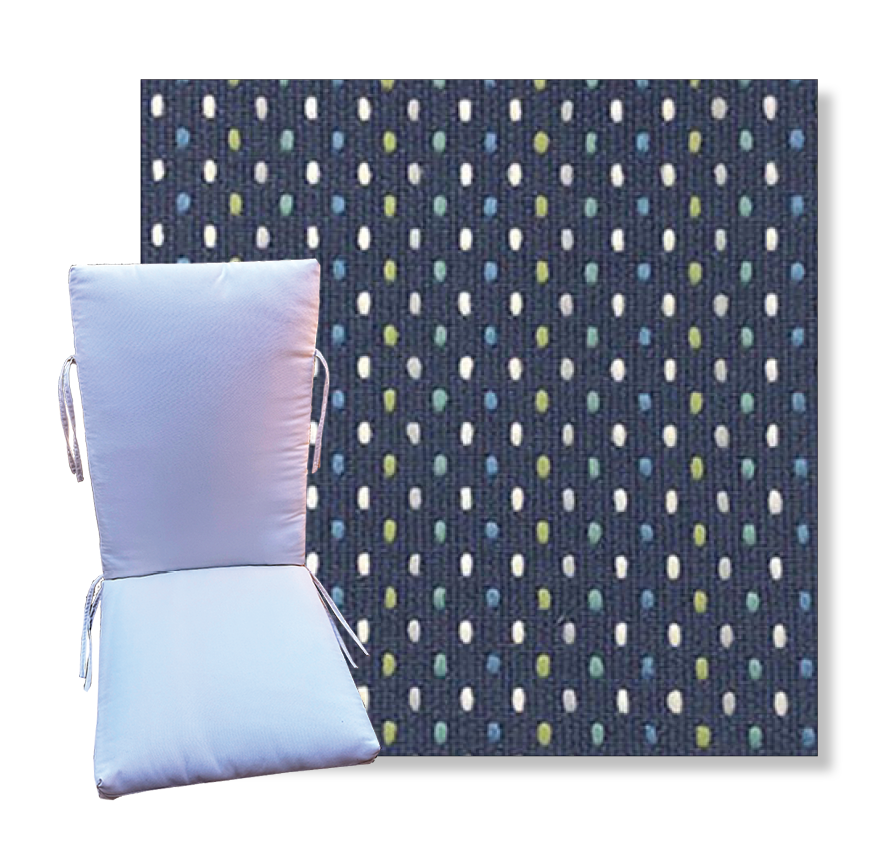 Order universal patio chair cushions in Revolution Outdoor Fabrics - Find a new colorful replacement cushion in 9 sizes - This style of patio chair cushion features a center seam, hinged design with fabric ties. These outdoor cushions are custom made to order in the USA, in the fabric and size you need.