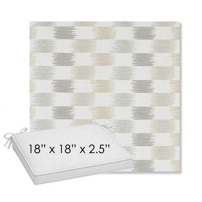18" x 18" x 2.5" Thick outdoor dining chair seat cushion designed for a simple, ready-to-order fit. Features a boxed construction with piping, fabric ties, and zipper opening. Made in 700+ Sunbrella® fabrics for long-lasting outdoor performance.