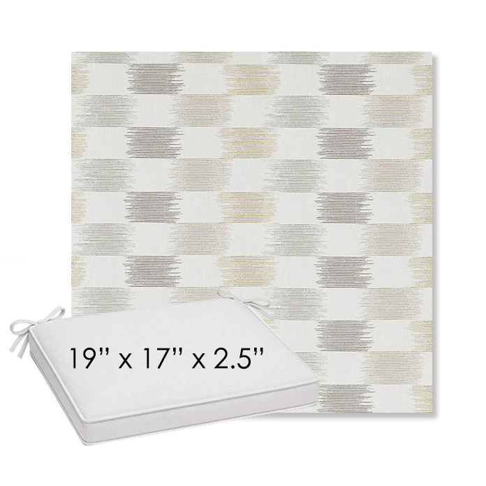 19" x 17" x 2.5" Thick outdoor dining chair seat cushion designed for a simple, ready-to-order fit. Features a boxed construction with piping, fabric ties, and zipper opening. Made in 700+ Sunbrella® fabrics for long-lasting outdoor performance.