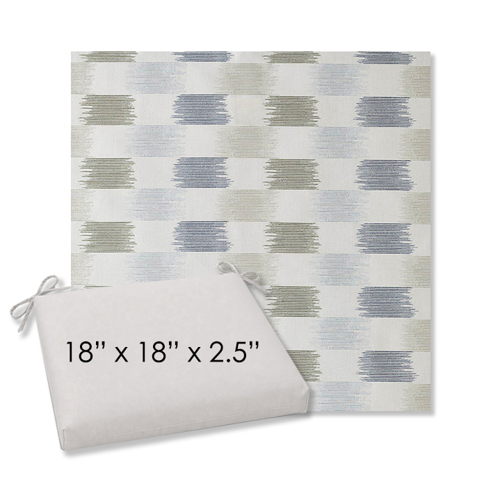 18" x 18" x 2.5" Thick - Universal outdoor dining chair seat cushion in Sunbrella Solution Dyed Polyester Outdoor Fabrics. Features with generous fabric ties and outdoor foam with polyester fiber fill—perfect for most patio dining chairs. Each Outdoor Patio Dining Chair Cushion is a center seam design and 2.5" Thick. All patio dining chair cushions are custom made to order in the size and fabric of your choice.