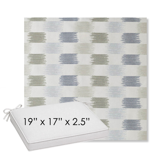 19" x 17" x 2.5" Thick outdoor dining chair seat cushion designed for a simple, ready-to-order fit. Features a boxed construction with piping, fabric ties, and zipper opening. Made in 700+ Sunbrella® fabrics for long-lasting outdoor performance.