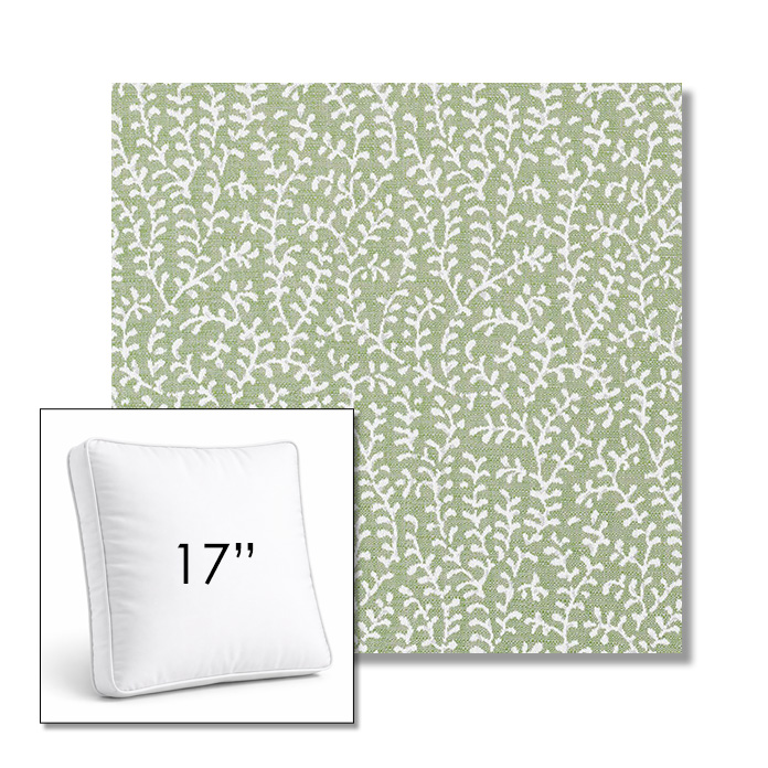 Custom 17" Square Boxed Sunbrella® Outdoor Pillow (3" Thick) available in over 700 Sunbrella® fabrics. Comes standard with piping. Optional covered button detail. Each pillow includes a zipper opening and premium outdoor insert for comfort, durability, and long-lasting outdoor performance.