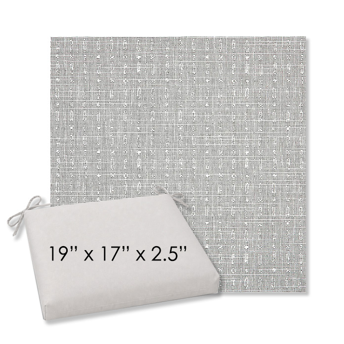 19" x 17" x 2.5" Thick - Universal outdoor dining chair seat cushion in Sunbrella Solution Dyed Polyester Outdoor Fabrics. Features with generous fabric ties and outdoor foam with polyester fiber fill—perfect for most patio dining chairs. Each Outdoor Patio Dining Chair Cushion is a center seam design and 2.5" Thick. All patio dining chair cushions are custom made to order in the size and fabric of your choice.