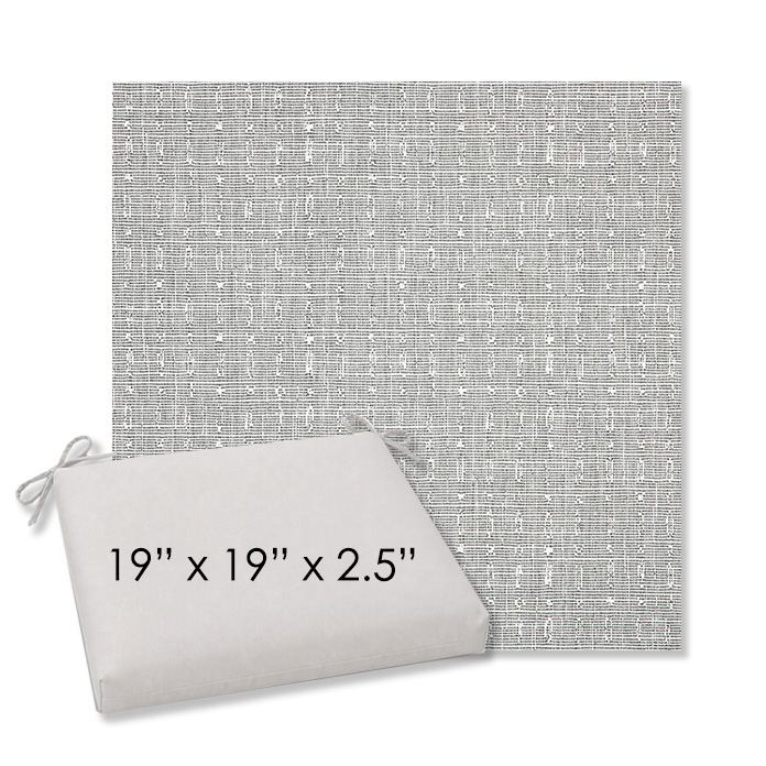 19" x 19" x 2.5" Thick - Universal outdoor dining chair seat cushion in Sunbrella Solution Dyed Polyester Outdoor Fabrics. Features with generous fabric ties and outdoor foam with polyester fiber fill—perfect for most patio dining chairs. Each Outdoor Patio Dining Chair Cushion is a center seam design and 2.5" Thick. All patio dining chair cushions are custom made to order in the size and fabric of your choice.