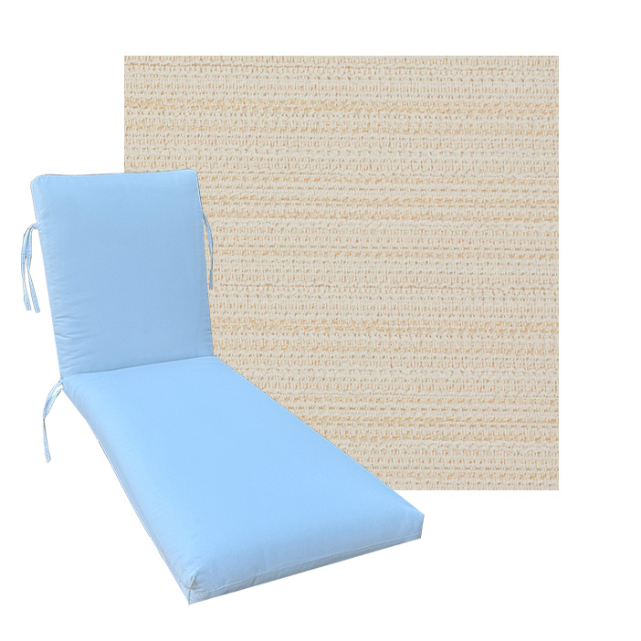 Classic Style Chaise Lounge Cushion. Premium Universal Chaise Lounge Replacement Cushions in 3 common sizes. Simple center seam design. No piping. Designed to accommodate aluminum, wood, and PVC furniture. Includes fabric ties at back and hinge. Polyester/densified fiber fill.