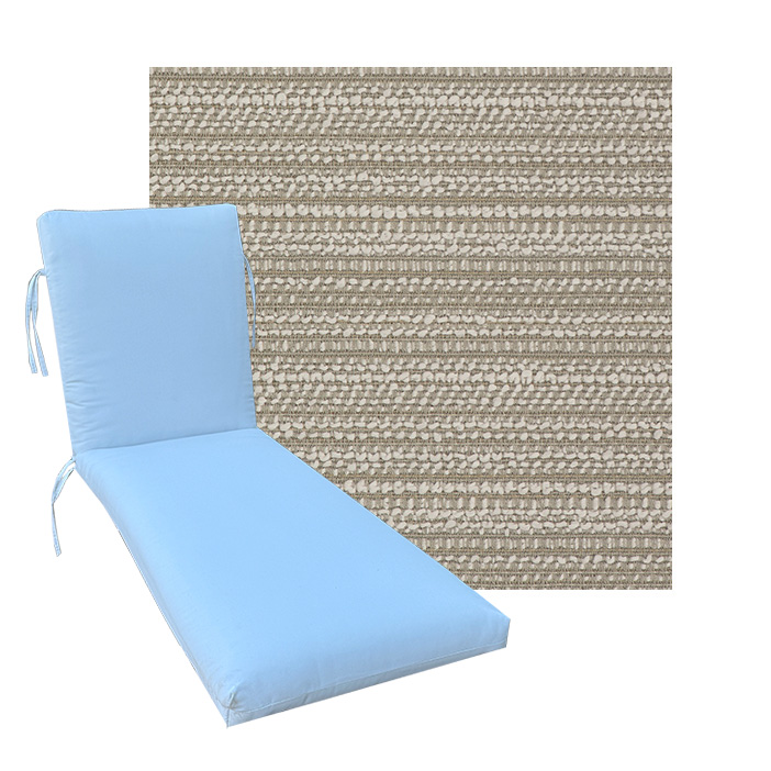 Classic Style Chaise Lounge Cushion. Premium Universal Chaise Lounge Replacement Cushions in 3 common sizes. Simple center seam design. No piping. Designed to accommodate aluminum, wood, and PVC furniture. Includes fabric ties at back and hinge. Polyester/densified fiber fill.
