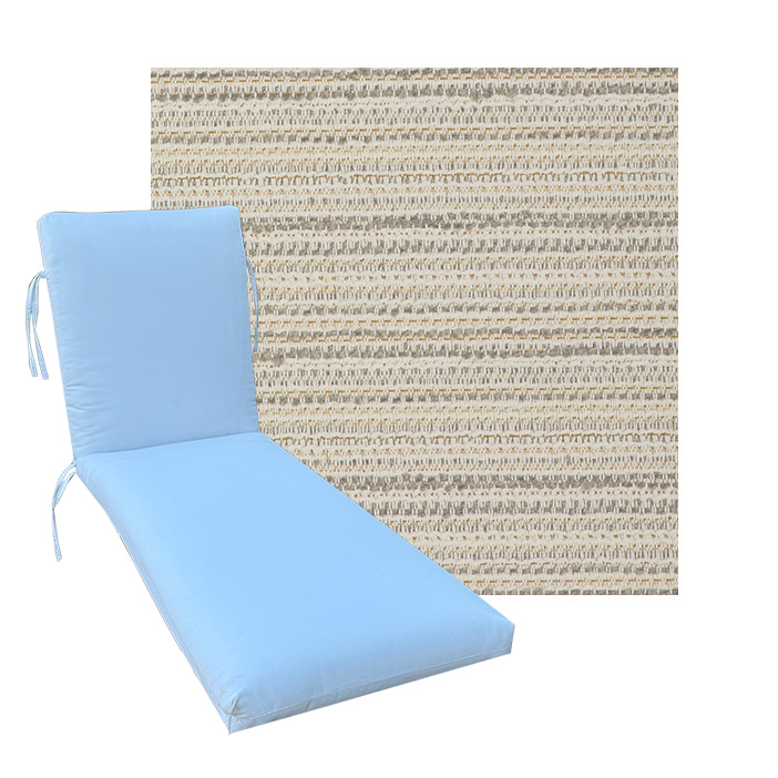 Classic Style Chaise Lounge Cushion. Premium Universal Chaise Lounge Replacement Cushions in 3 common sizes. Simple center seam design. No piping. Designed to accommodate aluminum, wood, and PVC furniture. Includes fabric ties at back and hinge. Polyester/densified fiber fill.