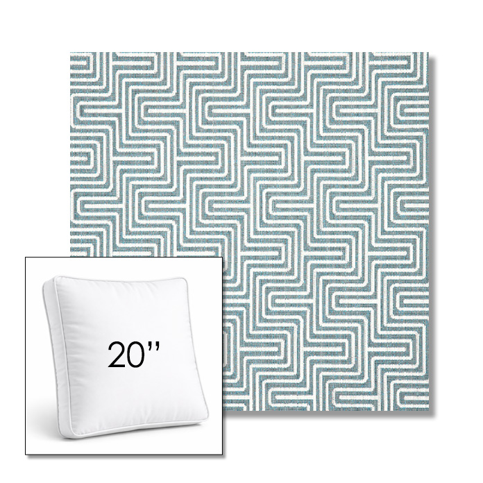 Custom 20" Square Boxed Sunbrella® Outdoor Pillow (3" Thick) available in over 700 Sunbrella® fabrics. Comes standard with piping. Optional covered button detail. Each pillow includes a zipper opening and premium outdoor insert for comfort, durability, and long-lasting outdoor performance.