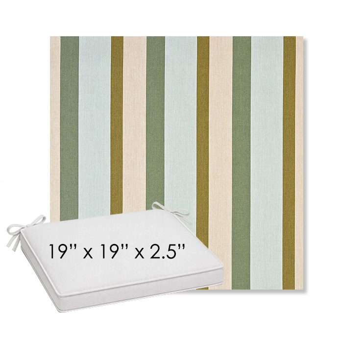 19" x 19" x 2.5" Thick outdoor dining chair seat cushion designed for a simple, ready-to-order fit. Features a boxed construction with piping, fabric ties, and zipper opening. Made in 700+ Sunbrella® fabrics for long-lasting outdoor performance.